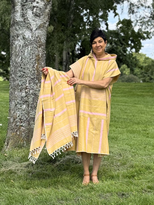 LoppuunmyytyHamam tunika hupullinen Raita sinappi-pinkki