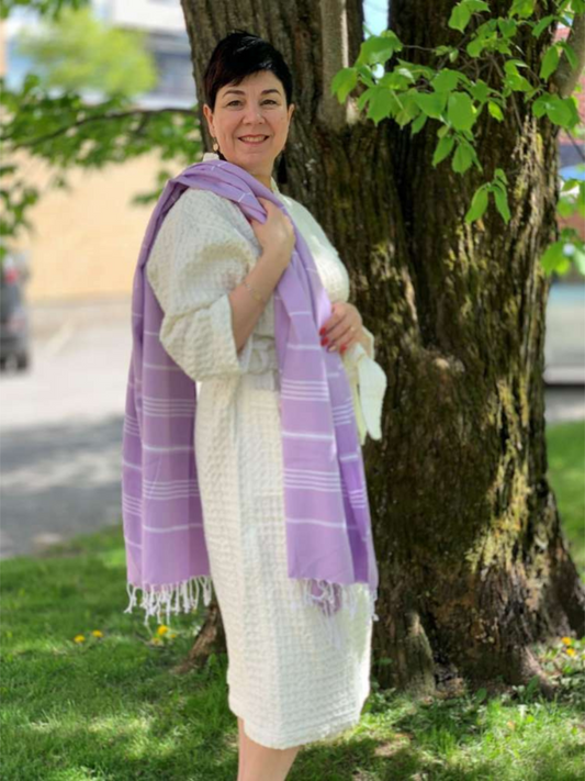 Hamam ja kreikkalaiset tunikat ja kylpytakit ovat ihanan kevyet ja ilmavat päällä, pehmeät ihoa vasten, kuivaavat hyvin ja kuivuvat nopeasti. Siksi ne toimivat hyvin Suomen kostean kesän olosuhteissa niin mökillä kuin veneessäkin. Nämä menevät pieneen tilaan ja ovat siksi loistava vaihtoehto myös reissuun mukaan.