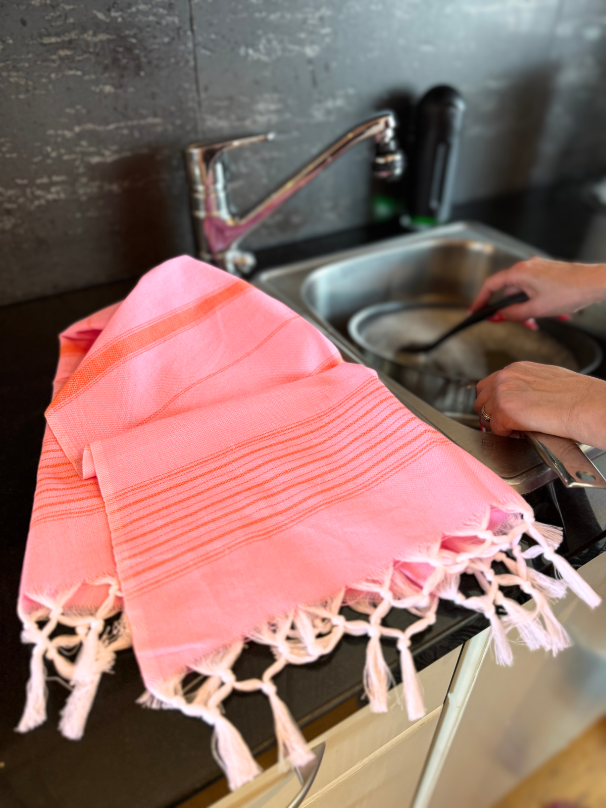 Raidallinen Hamam -käsipyyhe herkullisessa värissä! Aito Hamam -käsipyyhe kuivaa hyvin, kuivuu nopeasti ja menee pieneen tilaan.