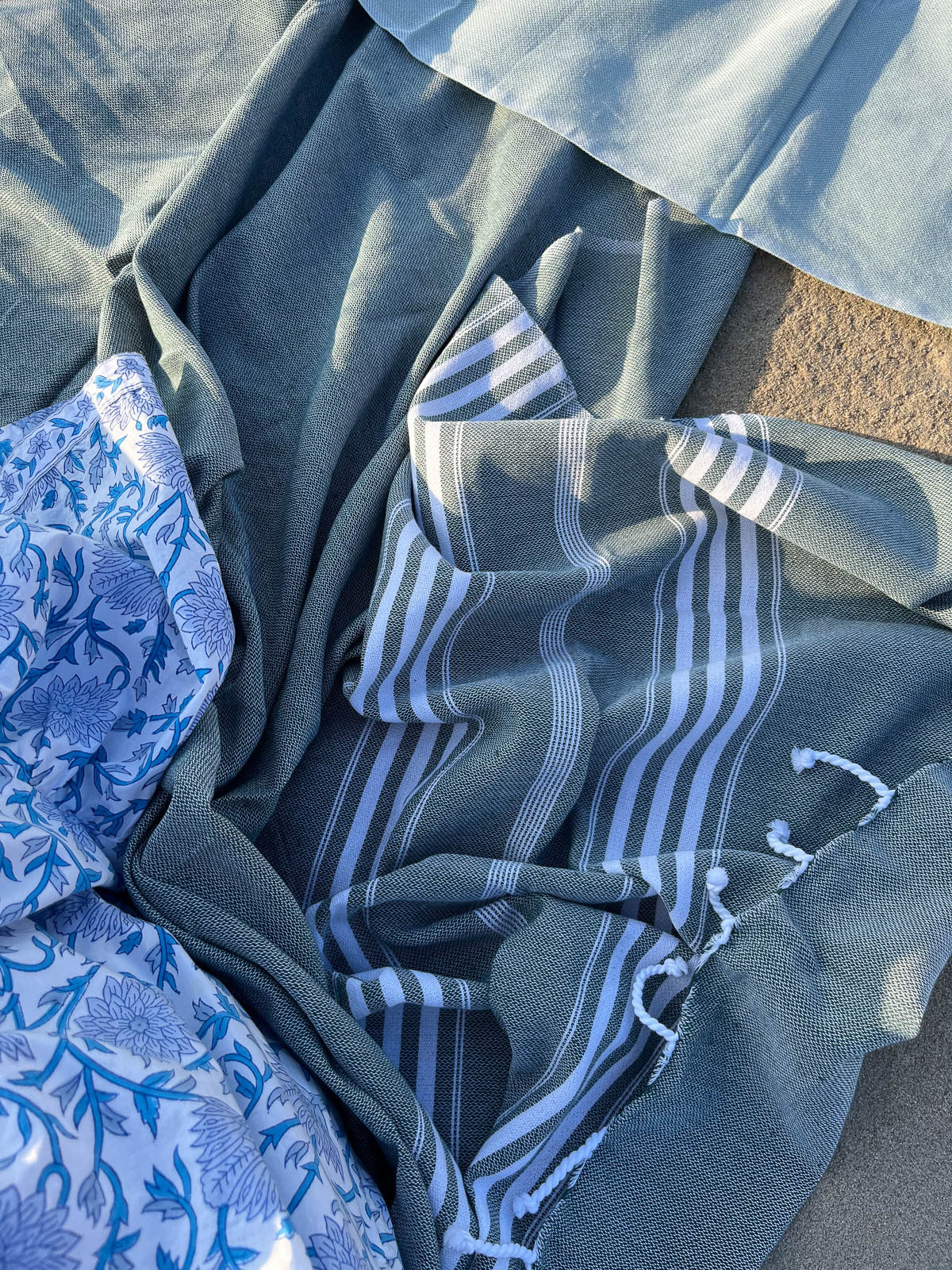 Hamam pyyhe menee pieneen tilaan ja on siksi loistava vaihtoehto myös rannalle, matkalle, kuntosalireppuun, laudeliinaksi, pöytäliinaksi, hartiahuiviksi, sohvan suojaksi, mielikuvitus vain rajana.