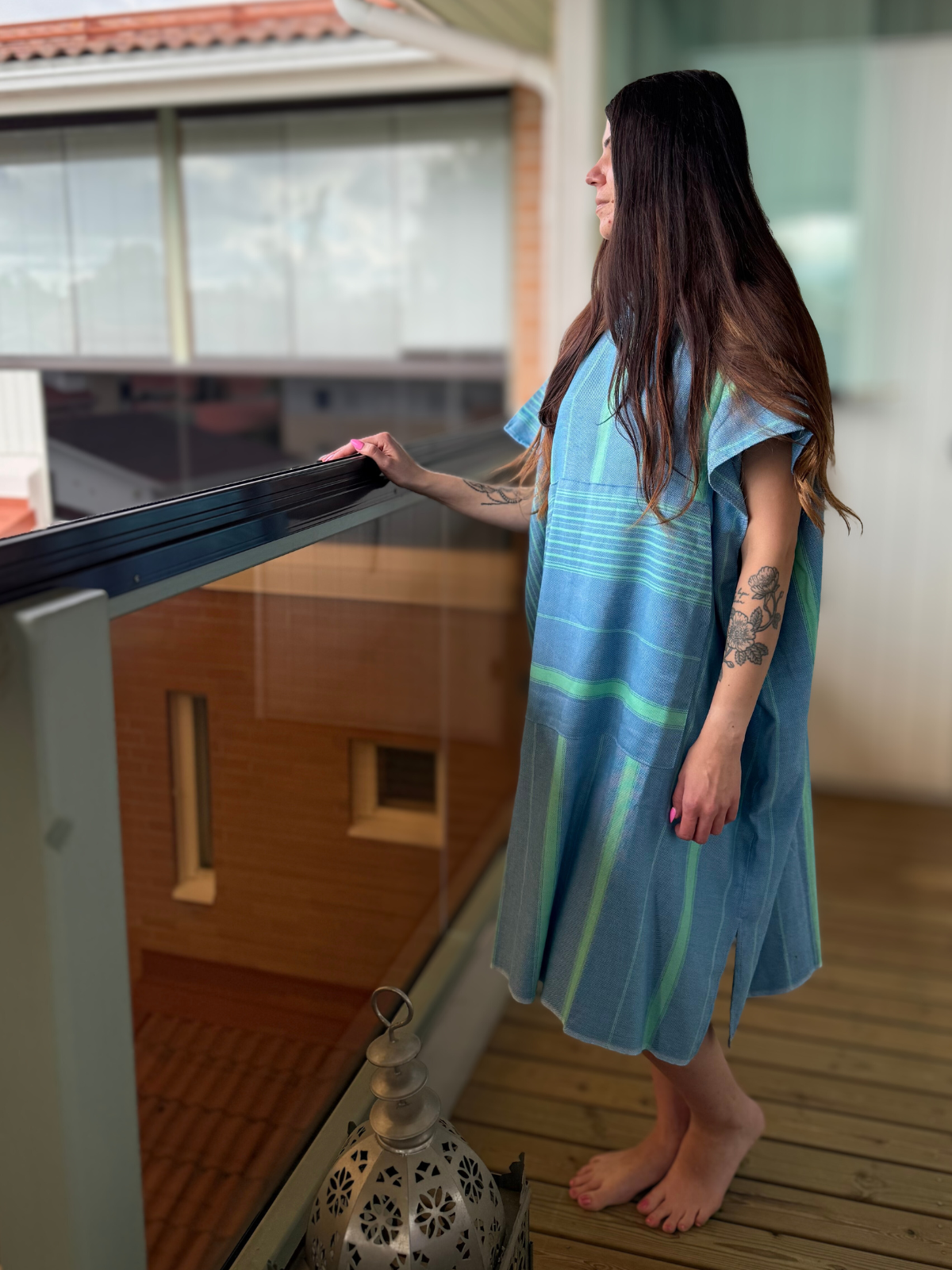 Hupullinen Hamam -tunika toimii Hamam -pyyhkeen lailla: ihanan kevyt, miellyttävän pehmeä ihoa vasten, kuivaa hyvin ja kuivuu nopeasti! Sopii kotiasuksi, rannalle, mökille ja matkalle! Pään ylitse puettava versio kylpytakista. Tunikassa iso kengurutasku edessä.