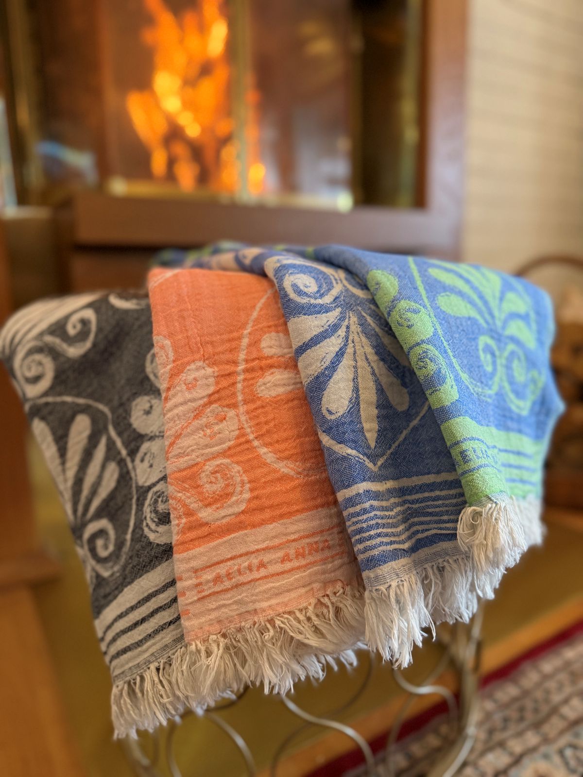 Pestemal -pyyhkeet ovat erittäin imukykyisiä, kuivaavat hyvin ja kuivuvat nopeasti. Pyyhkeet ovat kevyitä ja ohuita ja menevät pieneen tilaan. Kreikkalaiset pyyhkeet on myös käsin tehty. Valmistaja Aelia Anna.