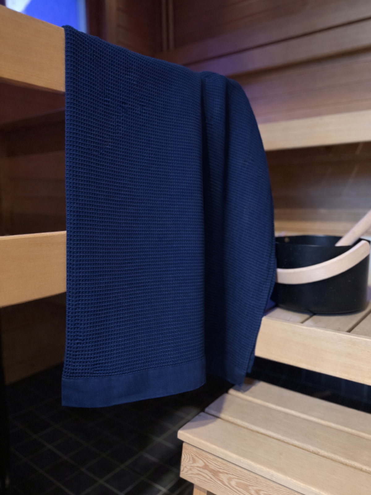 Upean pehmeä ja muhkea, sekä reilun kokoinen vohvelikylpypyyhe chambray-kanttauksilla.