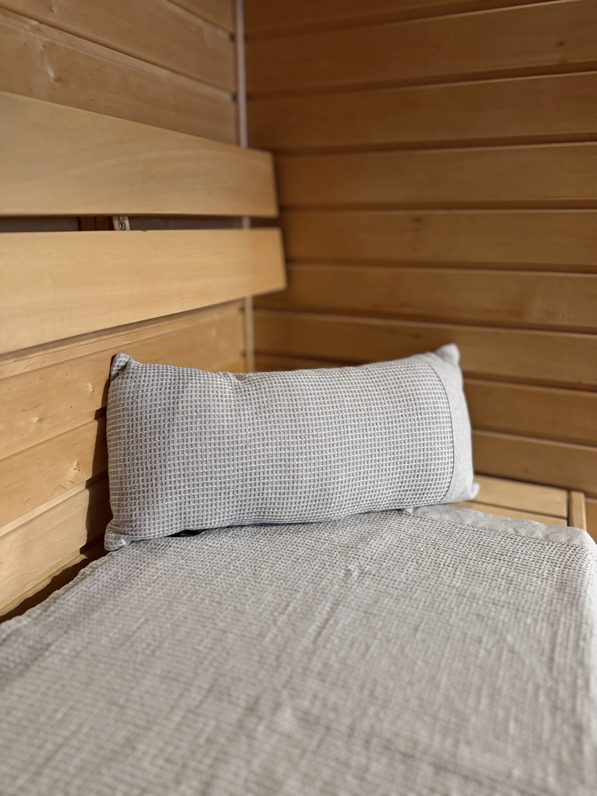 Kenno saunatyyny yksipuolisella chambray-kanttauksella on täydellinen pään ja niskan tueksi saunan lauteille.