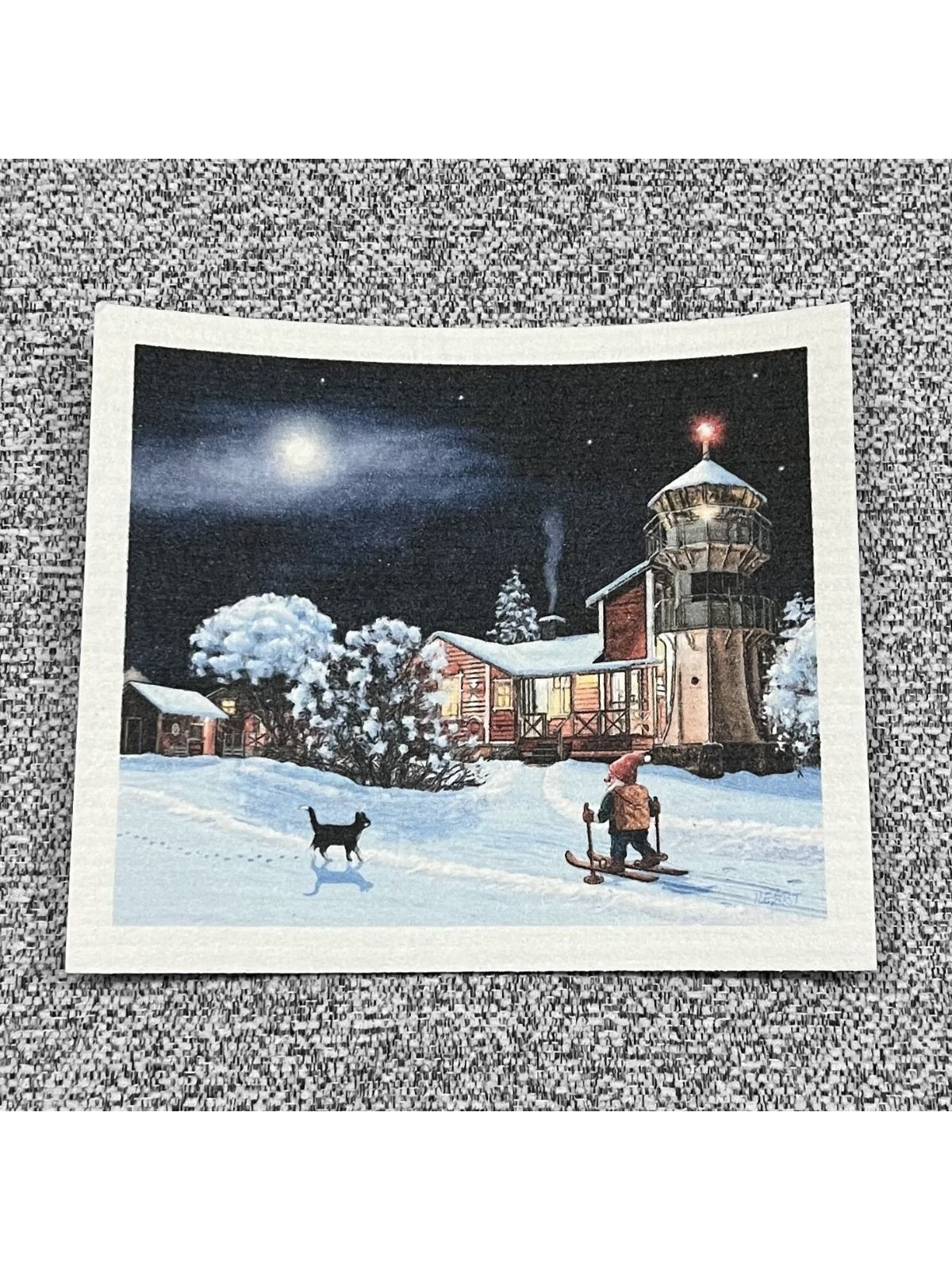 Ihana jouluinen tiskiliina Porin Kallon majakasta. Ekologinen ja Suomessa painettu tiskiliina.
